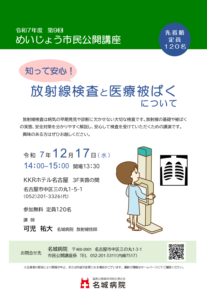 TOP お知らせ一覧 めいじょう市民公開講座(12/17)のご案内 お知らせ 一覧へ戻る めいじょう市民公開講座(12/17)のご案内 カテゴリ:イベント一般の方 2025-11-28 知って安心!放射線検査と医療被ばくについて 【日時】令和7年12月17日(水) 14:00-15:00(開場13:30) 【場所】KKRホテル名古屋 3F芙蓉の間 【参加費】無料(事前のお申込みは不要です) 当日先着順 120名 一覧に戻る