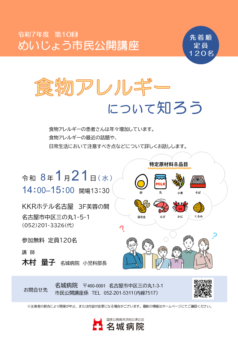 TOP お知らせ一覧 めいじょう市民公開講座(1/21)のご案内 お知らせ 一覧へ戻る めいじょう市民公開講座(1/21)のご案内 カテゴリ:イベント一般の方 2026-01-09 食物アレルギーについて知ろう 【日時】令和8年1月21日(水) 14:00-15:00(開場13:30) 【場所】KKRホテル名古屋 3F芙蓉の間 【参加費】無料(事前のお申込みは不要です) 当日先着順 120名 一覧に戻る
