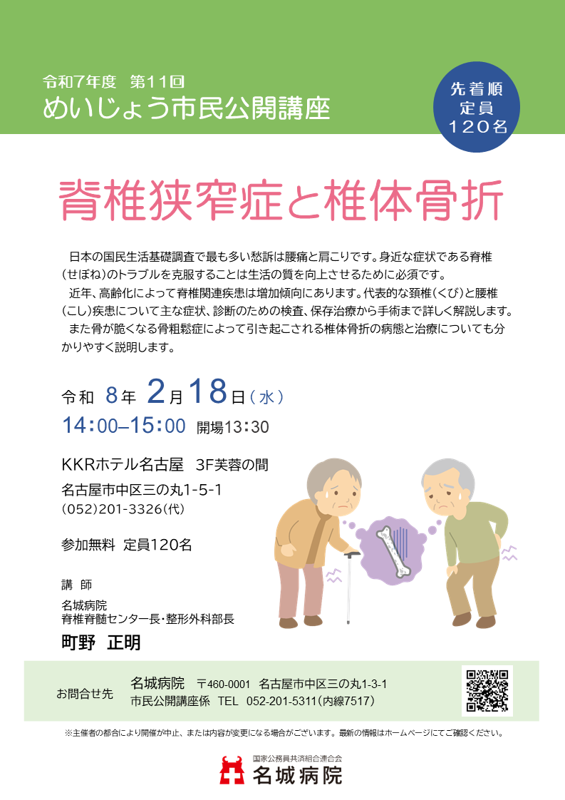TOP お知らせ一覧 めいじょう市民公開講座(2/18)のご案内 お知らせ 一覧へ戻る めいじょう市民公開講座(2/18)のご案内 カテゴリ:イベント一般の方 2026-01-29 脊椎狭窄症と椎体骨折 【日時】令和8年2月18日(水) 14:00-15:00(開場13:30) 【場所】KKRホテル名古屋 3F芙蓉の間 【参加費】無料(事前のお申込みは不要です) 当日先着順 120名 一覧に戻る