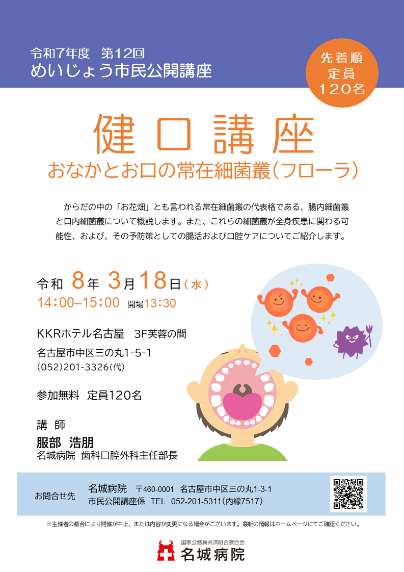 TOP お知らせ一覧 めいじょう市民公開講座(3/18)のご案内 お知らせ 一覧へ戻る めいじょう市民公開講座(3/18)のご案内 カテゴリ:イベント一般の方 2026-02-27 健口講座 ~おなかとお口の常在細菌叢(フローラ)~ 【日時】令和8年3月18日(水) 14:00-15:00(開場13:30) 【場所】KKRホテル名古屋 3F芙蓉の間 【参加費】無料(事前のお申込みは不要です) 当日先着順 120名 一覧に戻る